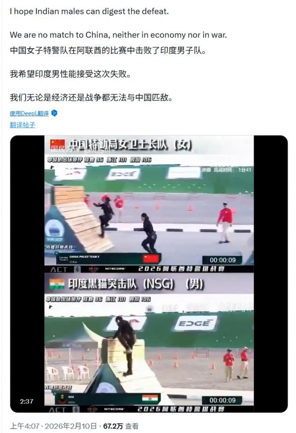 有网友把中国女队的比赛视频与印度顶级的黑猫突击队的放在一起对比,发现成绩足足快了二十多秒,要知道,双方的完成时间分别是2分08秒和2分31秒,这差距说吊打一点都不夸张吧。