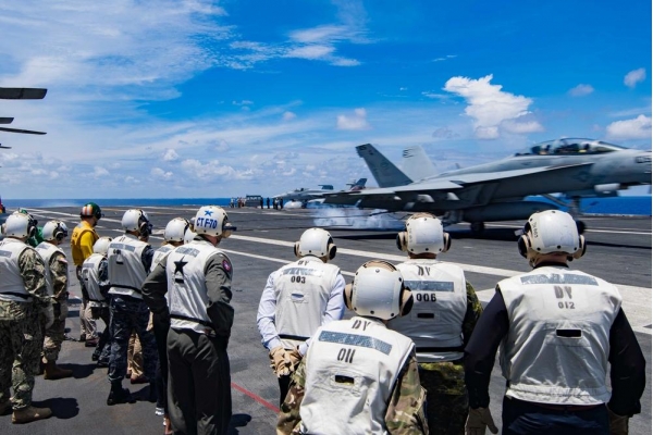【为了给盟友"打气",美军特意安排了相关人员观摩舰载机起降】