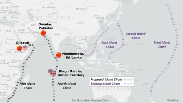 各位亲爱的朋友,我们一直处于两个不同的世界愿景或者说两种不同的对世界的想象之中,一个是至今仍由美国主导的国际秩序,我引用一张2018年美国智库的图,它在我们熟悉的第一、第二、第三岛链以外,再往西画了第四、第五岛链,一个在印度洋,一个在非洲东岸;当时大家觉得第四、第五岛链简直是异想天开,但现在看全球局势,四、五岛链已然成型。与此相对的,中国在这段时期提出的,无论是"一带一路"、全球三大倡议,都是在探讨一种新的地缘经济秩序,在这个秩序下,大家可以互利共赢。