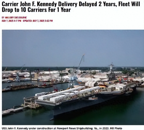 但现在看来,受制于拉胯的造船工业产能和工作效率,名为"新老航空母舰青黄不接"的这一天,终于还是到来了。作为"福特"级核动力航母二号舰的"肯尼迪"号,已经出现了不止一次的延迟交付,其原本计划于2022年服役,然后推迟到了2024年,随后又被推迟到了今年7月交付,结果现在直接被延后到了2027年上半年。于是乎,到了2027年3月,该舰会不会再度迎来延迟交付呢?下一次延迟交付的时间节点会是何时呢?恐怕任谁都很难说得准。