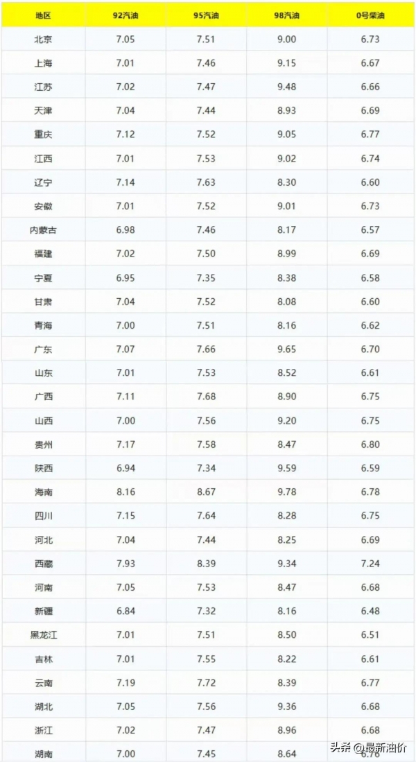 在文章的最后,今日油价最新资讯的小编就带各位车友去看看当前最新油价的报价情况。在油价连跌后,今天来到10月16日,全国各地最新的0号柴油和92、95、98号汽油价格情况(单位元/升):
