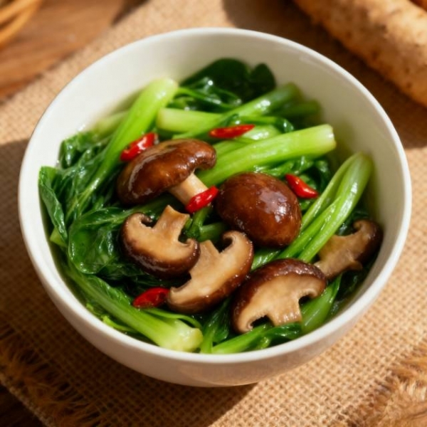 香菇含香菇多糖,是"天然免疫增强剂",能激活免疫细胞活性,提高身体抗病毒能力;青菜富含维生素和膳食纤维,补充营养的同时促进肠道蠕动。这道菜清淡少油,适合甲流期间吃,不会给肠胃添负担。