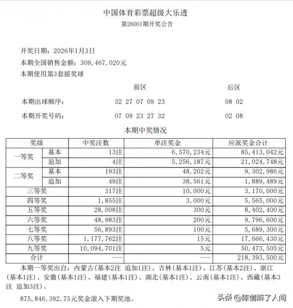 以下是本期的开奖公告:本期大乐透开13 注一等奖,花落 9地 ,每注657 万,一等奖出自内蒙古(基本2注 追加1注)、吉林(基本1注)、江苏(基本2注)、浙江 (基本1注)、安徽(基本1注)、福建(基本1注)、湖北(基本1注)、云南(基本1注)、西藏(基本3 注 追加3注)。 二等奖 193注 ,每注奖金4.8 万!三等奖 317注,每注 10000元。