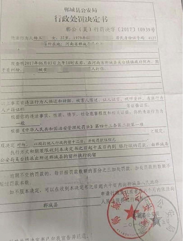 2017年6月,河南郸城一位干部崔某某与一名离异女性发生关系并致其怀孕,经调解后赔偿九万元,但该女性未就此罢休,前往镇政府闹事并与崔某某母亲发生争执,崔家二妹上前撕扯对方衣物,最终因侮辱罪被法院判处十个月有期徒刑,同一天,崔某某的妻子杨女士也到场扇了该女性两个耳光致其倒地,杨女士因此被拘留十五天并罚款五百元。