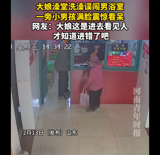 2月13日(发布),山东,大娘澡堂洗澡误闯男浴室,一旁小男孩满脸震惊看呆。网友:大娘这是进去看见人才知道进错了吧