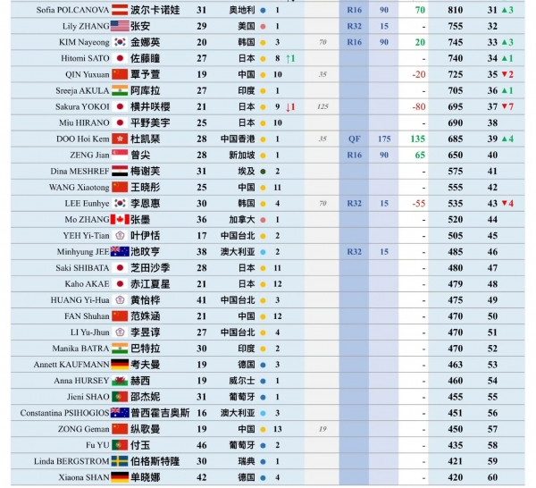 再来看看第21到40这个区间,值得关注的球员。这期间,国乒球员包括:第23名的钱天一,第27名的何卓佳,第35名的覃予萱。而日本队的名将平野美宇,本期继续排名第38位。