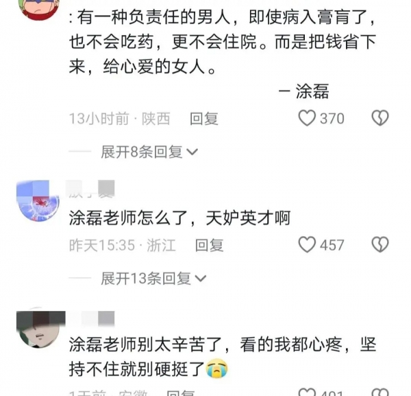 在涂磊老师晒出的照片中我们看的到,他一脸的病容,头发也白了不少,这么多年为了无数的人解决了情感问题,真的是太不容易了,最终把自己累病了,这份无私奉献与爱心,称之为英雄也不为过吧。