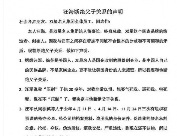 在1月3日晚间汪海公开的声明中,对于和汪军"断绝父子关系"的原因,列举了九项理由。其直指儿子汪军、儿媳徐英是美国人,双星名人作为民族品牌"不能让美国身份的人来接班"。