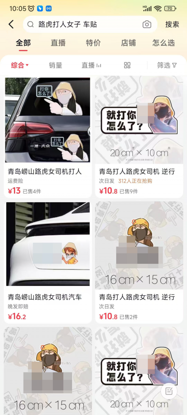 记者还发现,该电商平台的另几家商铺内,宝贝名均以"青岛崂山路虎女司机汽车贴纸"等文字作为卖点,女子卡通图像大同小异,但文字说明略有不同,有的配文"就打你怎么了""打你怎么了!"其中一家商铺此类车贴卖出27件。单品车贴一两天内能卖出几十件,销量算是不错了。