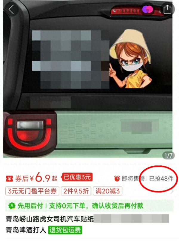 该店铺所售商品名称以"青岛崂山路虎女司机汽车贴纸"文字打头,车贴主角是一个女子卡通头像,与网上流传甚广的打人女司机外形相似。卡通头像配有调侃等文字。该车贴共有4种大小规格,价格从6.9元至20.9元不等。截至3日下午3点,系统显示该商品已被抢购48件,并标有"即将售罄"字样。