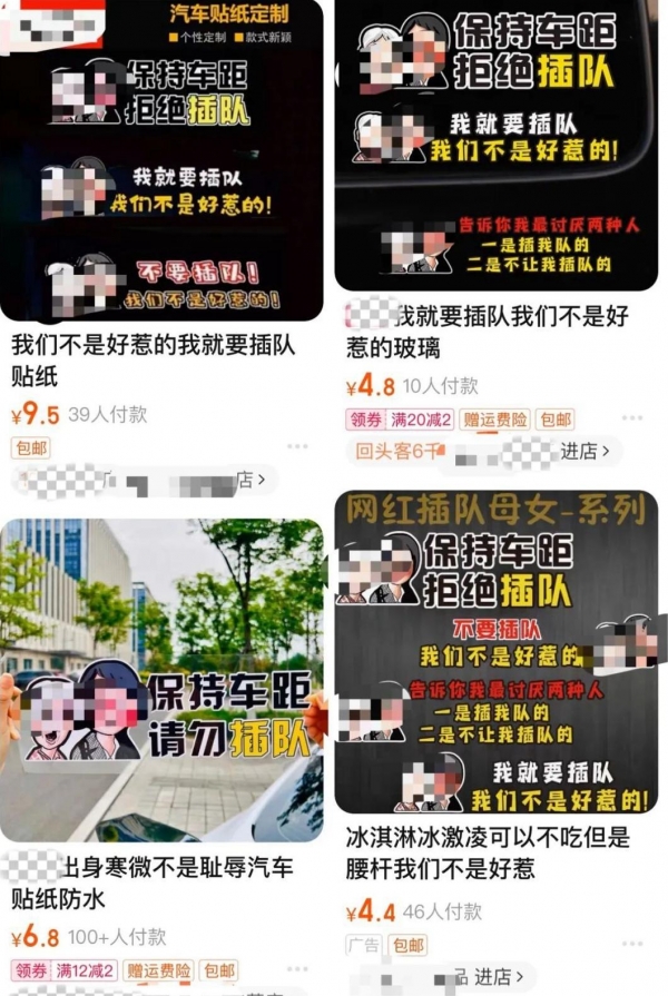 据当时媒体报道,在淘宝平台搜索"插队""车贴"等关键词,有超过30家店铺在销售以两女子漫画图为主题的汽车贴纸,还配文"不要插队,我们不是好惹的""告诉你我最讨厌两种人,一是插我队的,二是不让我插队的。"当时一家店铺的客服人员称,借着插队事件的热度,车贴一天就卖出去了十多个。