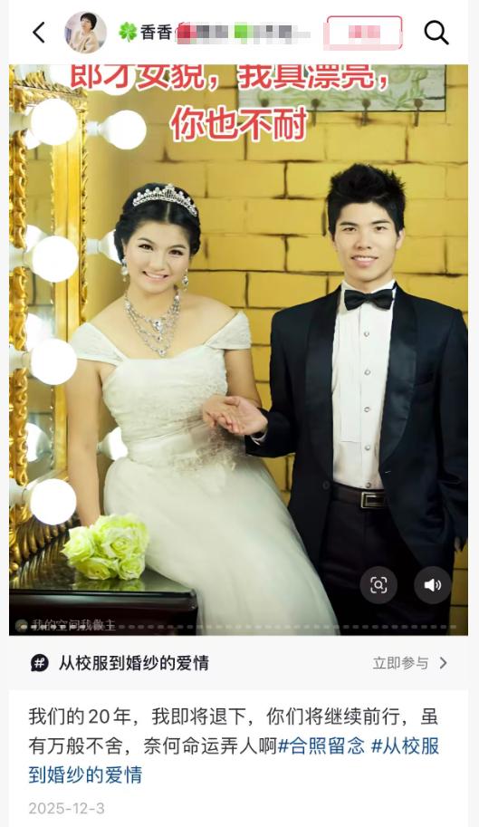 12月份,香香曾发布一则动态与家人提前做告别,她告知自己和老公是从校服到婚纱的爱情,两人在一起20年了,虽然有万般不舍,但奈何命运弄人,想来此时的她已知自己的时日不多了。