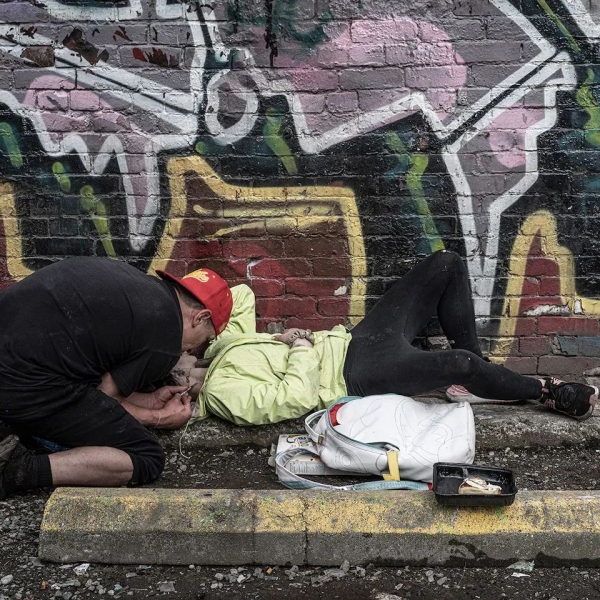 如今在加拿大的温哥华、卑诗省等地,许多公共街道上,都能看到正在注射毒品的人。他们如同行尸走肉一般,躺在肮脏的街头巷尾,身体呈现出怪异的动作,呆滞地停留在原地。这些都是注射了芬太尼后表现出来的"僵尸症"。