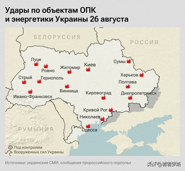 一是打击电力设施。基辅、文尼察、日托米尔、赫梅利尼茨基、第聂伯罗彼得罗夫斯克、波尔塔瓦、尼古拉耶夫、基洛沃格勒和敖德萨地区的变电站均遭到打击,多地停电。