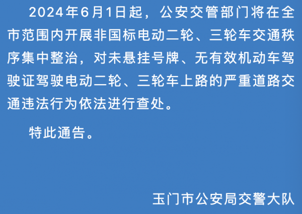 车上路必备车牌,同理,人骑车必须持有对应的驾驶证。玉门在发布的通告中明确表示,在2024年6月1日开始将对无有效机动车驾驶证驾驶非标电动车等交通违法行为进行查处。