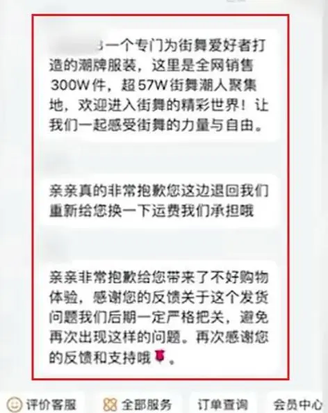 事发后,陈女士联系到了平台,向客服反应了此事。从客服回应的信息来看,这家店铺是一个主打为街舞爱好者提供潮牌服装的店铺,而且全网销售超过300万件,显然,这不是一家小店铺,可还是出现了这种情况。
