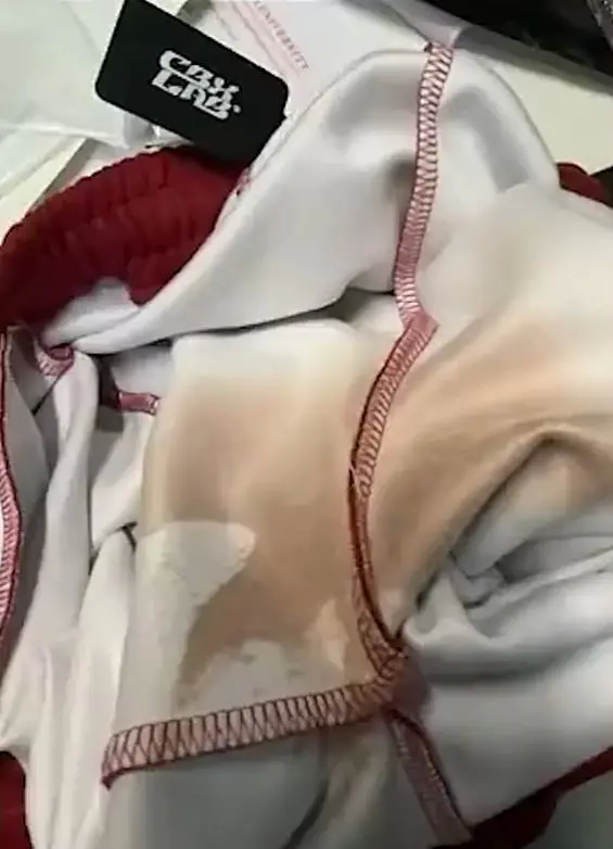 我们从陈女士自己曝光的图片中能够看到,确实如陈女士所描述的那样,在内里裆部有着显眼的红色污渍,陈女士认为是血迹浸染后留下的污渍,虽然经过清洗后,却依然未能完全洗干净。