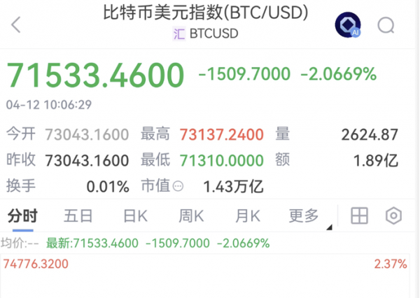 4月12日,比特币价格直线跳水,盘中一度跌破71300美元关口,日内跌幅超2%,打破本周震荡上行态势,主流币种同步走低,市场恐慌情绪蔓延。
