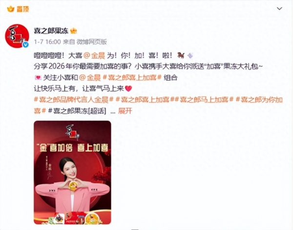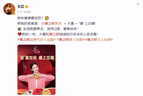 此前于1月7日,该账号曾置顶发布金晨代言宣传,并配文"喜之郎喜上加喜组合"并@金晨的个人微博。