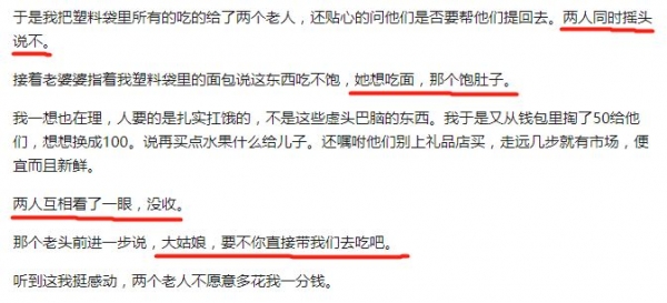 于是女孩将刚从超市买的所有吃的,都给了这两个老人。