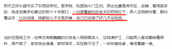 可怜兮兮地告诉她没钱吃饭,钱都给儿子交医药费了。