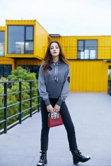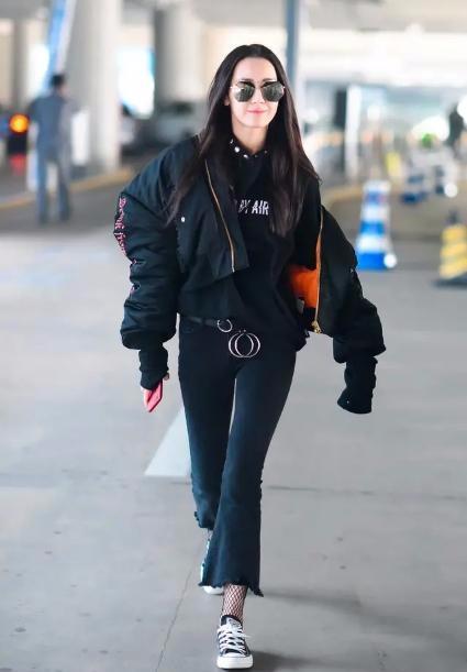 迪丽热巴私下的穿搭也是非常时尚,一身黑的打扮,更是把人的优点全部展现了出来,喇叭裤非常有时尚气息,而且对于小腿粗的女生来说非常友好,里面搭配镂空丝袜,显得有点小性感,外面配一件黑色棒球服外套,街头风格十足,让人看上去非常青春有活力。这种搭配适合大多数女生,尤其是对胖女生来说,时尚还遮肉。