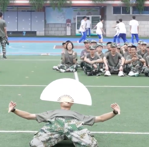 一名男同学手持折扇即兴跳了一段国风舞蹈,他的舞蹈动作流畅飘逸中带着男孩的力量感,后空翻、侧翻等动作燃爆全场。