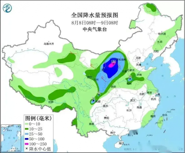 8月9日,大雨、暴雨主要分布在以下地区:受西南季风和冷空气的影响,一是西藏南部、四川、陕西南部、甘肃东南部、湖北西北部、重庆中西部、贵州西北部和中部、广西北部等地有小到中雨,局部地区有大到暴雨,其中四川中部、重庆西南部有大到暴雨,最大降雨量为90毫米;二是内蒙古中东部、山西、河北、北京、天津、山东西部、河南西北部、辽宁西部、吉林西部、黑龙江西南部和北部有小到中雨,局部地区有大到暴雨或大暴雨,其中河北中北部、北京、天津有暴雨大暴雨,最大降雨量为150毫米。