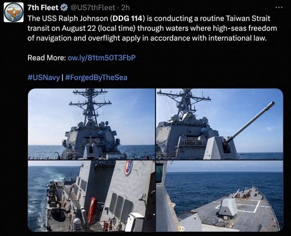 8月22日,美国海军一艘"阿利伯克"级驱逐舰和一架RC-135W,这款侦察机再度进入台湾海峡挑衅。与此同时,此次美军的海空联动,其目的就是测试我方相关作战力量的反应速度与通信位置等情况。期间,台军还通过导弹试射与美军遥相呼应。面对美台勾结的异动,解放军当机立断,包括空警500、歼-16在内,41架次战机升空反击,给予美军和台军强有力的震慑。