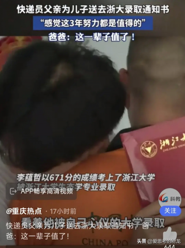 邮政快递员老爸亲自送来了浙江大学录取通知书