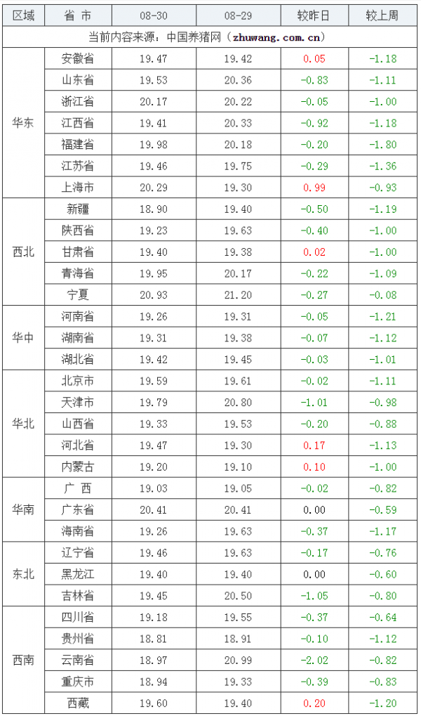 猪价下跌地区(23个):福建省、江苏省、湖北省、广西壮族自治区、贵州省、青海省、湖南省、浙江省、河南省、北京市、海南省、辽宁省、广东省、重庆市、山东省、四川省、江西省、新疆维吾尔自治区、宁夏回族自治区、天津市、山西省、吉林省、云南省;下跌区间:0.02-2.02元/公斤;