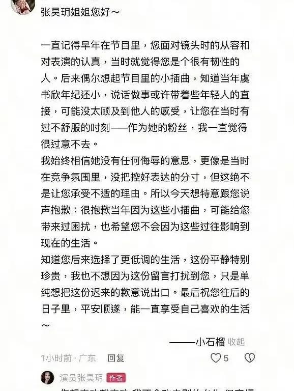 有虞书欣的粉丝假装大度,替虞书欣道歉,说那时候她年纪小,说话直。张昊玥可不吃这套,直接回:"你想喜欢谁就喜欢谁,别在我这说这些话。"