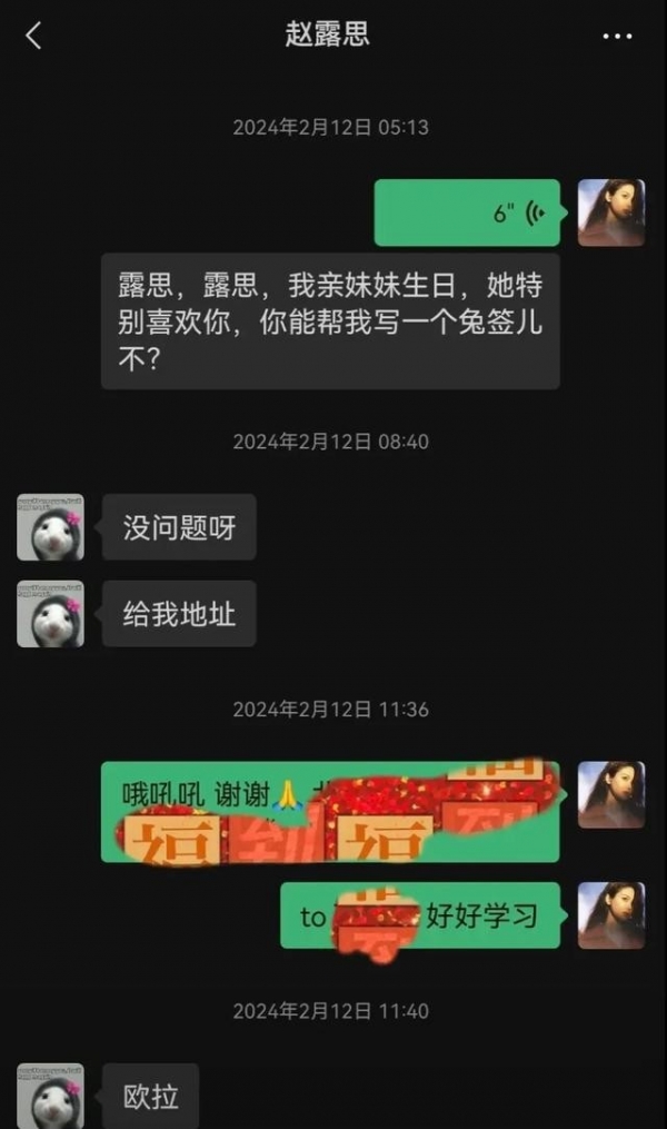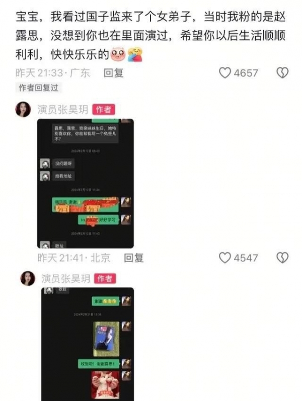 张昊玥看到这留言很高兴,还晒出了和赵露思的聊天记录。她帮妹妹要赵露思的签名照,赵露思真的寄过去了,人很好。