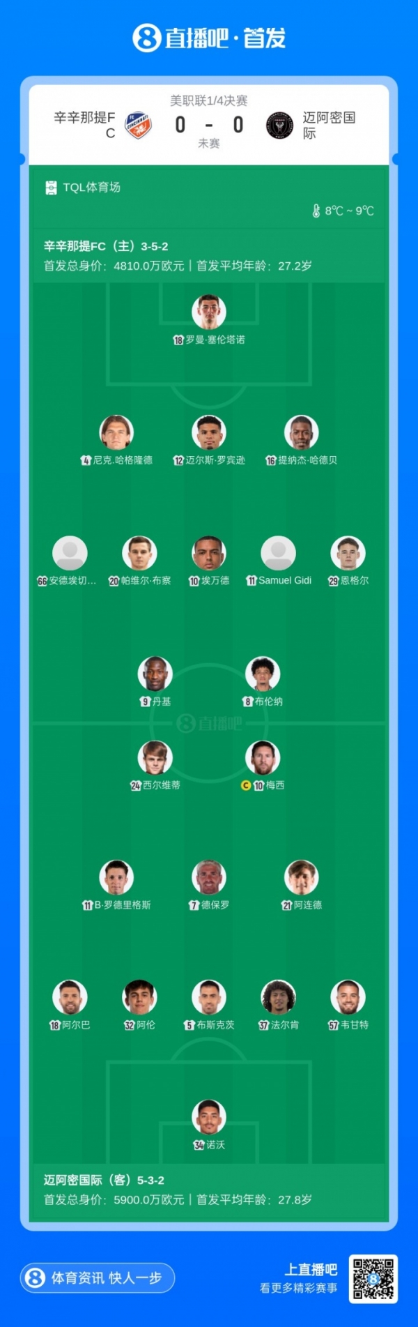 直播吧11月24日讯 北京时间11月24日6:00,美职联1/4决赛,辛辛那提FCvs迈阿密国际。赛前双方公布了首发名单。