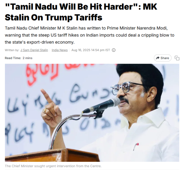 泰米尔纳德邦首席部长M.K.斯大林写信给莫迪,警告称,美国对印度进口产品征收高额关税可能会严重打击该州出口驱动型经济。 印媒报道截图