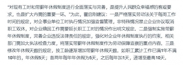 此前,霍启刚就曾在两会上提出建议增加年轻人的年假天数,并且要强制实施带薪年假政策。