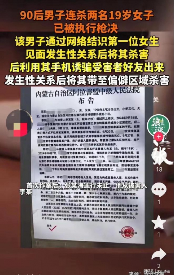 - 值得关注的是,这个案子判决得很快,2025年阿拉善盟中院一审认定了两起故意杀人罪和一起非法拘禁罪,数罪并罚判处死刑,张某没有提出上诉,最高人民法院在年底核准了判决,2026年1月23日,他在内蒙古被依法执行枪决。