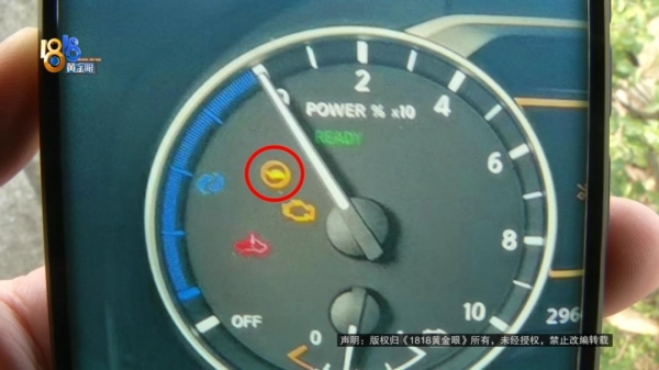 蒋先生当时拍了照片,左边的仪表盘跳出三个故障灯,最上面那个图标是一只"乌龟",一般来说乌龟灯亮起代表车辆电池或动力系统出现异常,需要立即减速并检修。