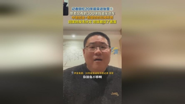 3月31日,张雪纪录片拍摄者、原湖南卫视 《晚间》记者易军接受采访表示:"我是(台式)电脑立备一份,笔记本电脑里备份一遍,再买个硬盘再备份一遍,前前后后买90块硬盘,花了8万块钱,那时候一块硬盘1500块钱。有时候我静下心来、夜深人静或者没有事的时候、空闲的时候,我就把这些片子拿出来看,有时候经常看到自己泪流满面。"