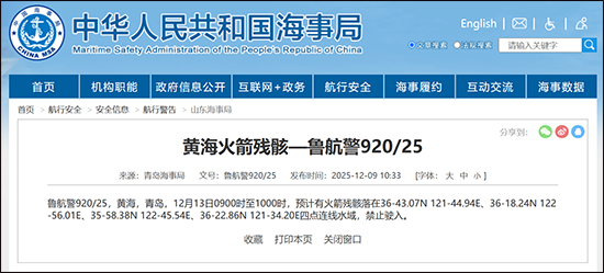 中国海事局网站消息,青岛海事局发布航行警告,12月13日9时至10时,黄海水域有火箭残骸掉落,禁止驶入。