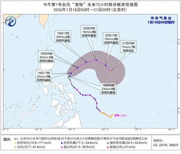 今年第1号台风"洛鞍"已于今天(18日)凌晨减弱为热带风暴级,其中心早晨5点钟位于菲律宾马尼拉东偏南方向约400公里的洋面上,就是北纬15.0度、东经124.7度,中心附近最大风力有9级(23米/秒),中心最低气压为990百帕,七级风圈半径150-300公里。