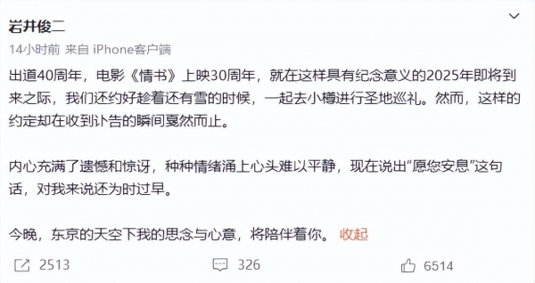 中山美穗和柏原崇合作《情书》被誉为日本第一美少女及美少男,柏原崇退圈多年,没有回应此事。导演岩井俊二在微博发文悼念,表示和中山美穗约好一起进行圣诞巡礼庆祝《情书》上映30周年,然而这样的约定却戛然而止。