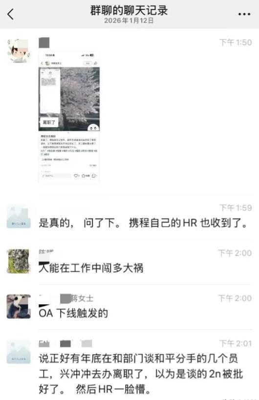 1 月 11 日晚上 8 点多,不少携程员工正抱着外卖追剧,手机突然震动 -- 一条短信弹出来,开头就是 "XX 你好,感谢一路相伴",后面跟着 "请于 3 个工作日内办理离职手续" 的正式措辞。有人揉了揉眼睛,以为自己看错了;有人赶紧翻聊天记录,生怕漏了什么通知;更绝的是,HR 部门的小伙伴也收到了这条短信!