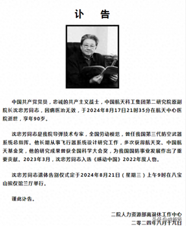 2024年8月19日,中国航天科工二院发布讣告,告诉大众沈忠芳同志在8月17日因病救治无效,最终离开了我们。