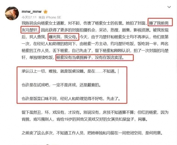 娱乐圈真是永远不缺大瓜!这不,咱们的"小猴紫"杨紫又双叒叕上热搜了,关键词居然是"陪睡"?!这瓜,真是让人猝不及防,惊掉下巴啊!事情是这样的,一位名叫陈某含的网友,微博名"mnw_mnw",在网上爆料,声称杨紫为了拿到好资源,竟然"陪睡"了她的前男友冯楚轩!好家伙,这信息量有点大啊!一时间,网上炸开了锅,各种猜测、议论满天飞。有人心疼杨紫,觉得她是被冤枉的;也有人质疑,娱乐圈嘛,这种事也不是不可能发生……