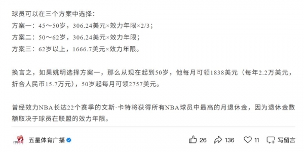 NBA的养老金是阶梯式分档的:从45岁到50岁,每月可以领取306.24美元×效力年限×2/3;50岁到62岁,每月可以领取306.24美元×效力年限;62岁以后,每月可以领取1666.7美元×效力年限。