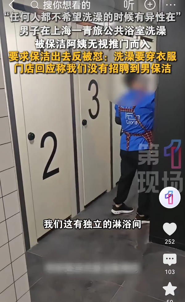 青旅后来回应了,说保洁确实没进淋浴间内,但承认是在有人洗澡时还在外面擦镜子、拖地。他们没招到男保洁,所以目前全由女员工负责。解决办法?贴张告示,提醒客人"如介意,可避开保洁时间洗澡"。