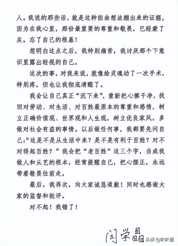 在致歉信中,闫学晶坦言,看到公众批评时满心委屈,通读网友评论后才幡然醒悟。