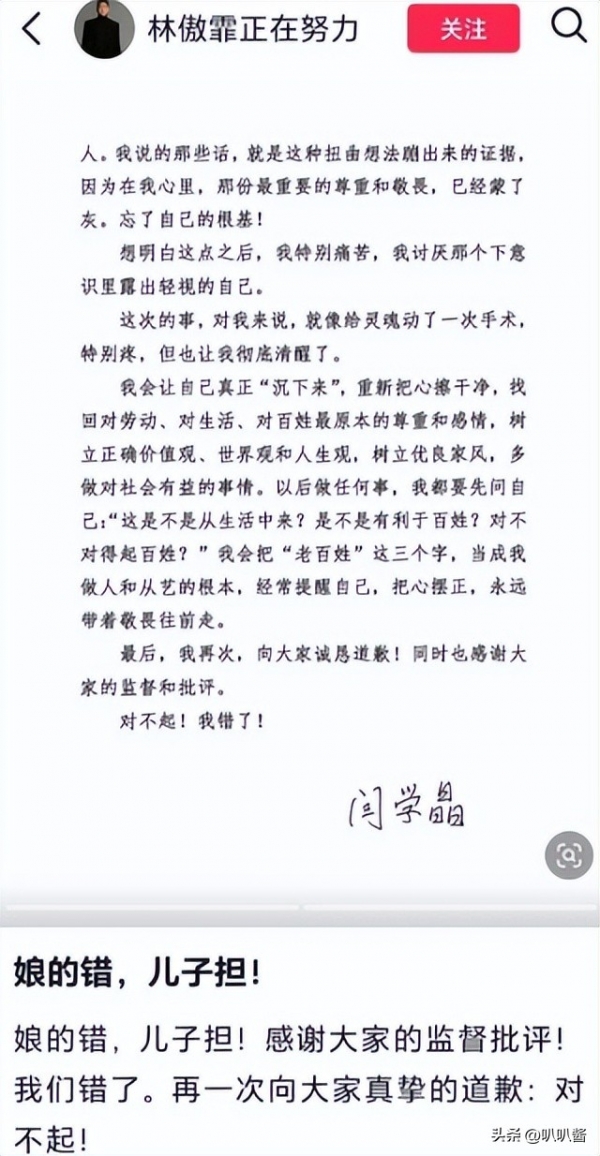 随后,她的儿子林傲霏随后转发该致歉信,并配文"母亲之过,儿子共担"。