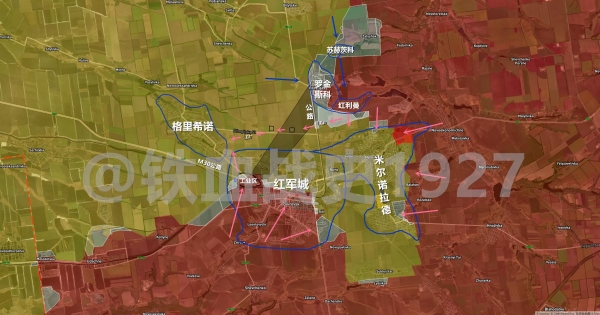 负责防守红军城市区的乌军第7空突军称,为了包围红军城市区,俄军在这里投入了约1.1万人,以便于向该市的西北和北部推进,在第7军的防区内,俄军总共部署了约2.7万人、100辆坦克、260辆装甲战车和多达160门火炮和迫击炮,这里指的是红军城市区及其郊区。另外,乌军第7军还发布了一张局势图,标注了俄军的主要进攻方向有三个:一是攻打北部的罗金斯科;二是进攻米尔诺拉德正东;三是突击红军城西北部,并向格里希诺开进。